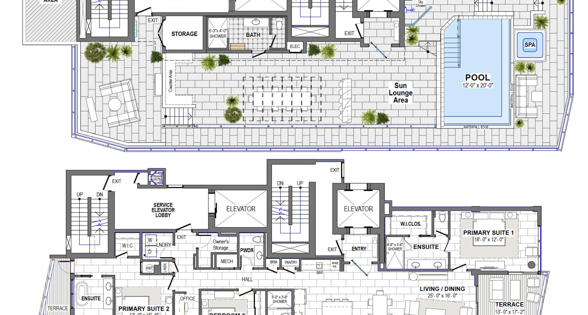 Simply breathtaking – the Corner Sky Villa Penthouse at Aqua Bay offers the most spectacular views in the Cayman Islands. As the newest Seven Mile Beach real estate opportunity from Butler Group, one of Grand Cayman’s premier builders of luxury resort condominiums, this is your opportunity to live the dream on Seven Mile Beach with only four of these coveted villas being created.The interior design has been developed by Butler Group’s award-winning partner company, Design Studio Interiors. All Sky Villa Penthouses feature expansive floor to ceiling glass walls, high ceilings, superior tile and flooring options, top quality plumbing and appliance selections as well as bespoke millwork design for the kitchens, bathrooms, and amenity areas.At an expansive 5,208 sq. ft. this Sky Villa Penthouse features 3 bedrooms and 4.5 bathrooms over two stories. The large first level touts 2,470 sq. ft. with an open concept living/dining area and kitchen with wet bar, 2 Primary Bedrooms Suites each with luxurious spa bathrooms - one with access to a large terrace with stunning views of Seven Mile Beach and the other facing North Sound with a terrace to enjoy incredible sunrises and views to Rum Point and Cayman Kai, a powder room, a home office, and laundry room. The Sky Decks are a world of their own with private elevator and 4.5ft deep infinity edge heated pool and spa, multiple lounging areas, outdoor kitchen and bar and al fresco dining. This Sky Villa Penthouse expands this pure luxury with sky shower, fitness studio and massage suite both with spectacular sunrise views of the North Sound. This enhances private space expands your living area to an unprecedented level on Seven Mile Beach and creates an unmatched opportunity for investment return.Following Butler Group’s forty-four-year reputation for building excellence, Aqua Bay will be engineered and constructed to the highest standards. Elevated over 16 ft. above sea level for privacy and storm protection, this structure will utilize the latest specifications for the building’s essential services, including solar tinted, hurricane rated glazing systems.Amenities will include boutique hotel style reception, 90 ft. wide beachfront, 4.5 ft waterfall edge pool, extensive pool deck and private beach, two beachfront BBQ areas for al fresco dining, fitness centre, oceanfront lounge and games room, on site manager’s office, undercover parking for each villa, day room facilities for late checkout options and lush tropical landscape design. Aqua Bay will offer a daily rental program which owners can utilize while not in residence, making this building the newest and most luxurious daily rental destination in Grand Cayman.Sales price does not include any artwork, ornaments or personal effects.